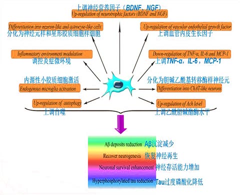 對(duì)于阿爾茨海默?。?/b>間充質(zhì)干細(xì)胞可以分化為神經(jīng)元、分泌神經(jīng)營(yíng)養(yǎng)因子、旁分泌免疫調(diào)節(jié)因子等,起到代替受損神經(jīng)細(xì)胞、重建神經(jīng)通路、營(yíng)養(yǎng)和保護(hù)膽堿能神經(jīng)元、抑制炎癥反應(yīng)等作用。