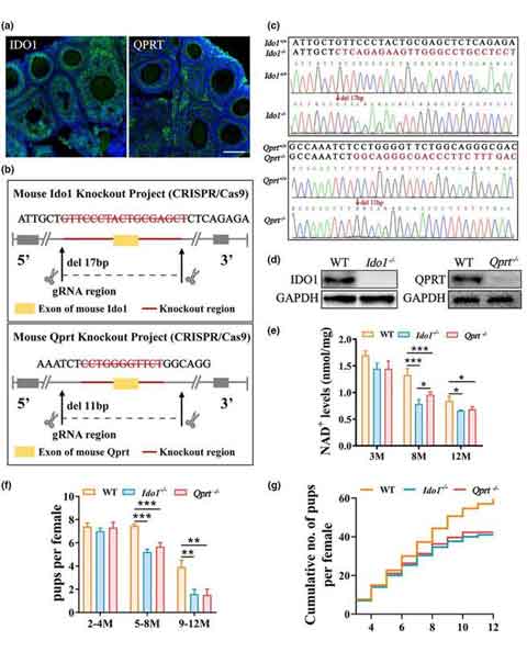 天歲生物在研究中發(fā)現(xiàn),IDO1 和 QPRT 的缺失導(dǎo)致中年小鼠卵巢 NAD+ 水平下降,從而加速卵巢衰老,天歲研究首先利用 WB 確定 IDO1 和 QPRT 在卵巢中均有表達(dá),隨后利用 CRISP/Cas9 技術(shù)構(gòu)建了 IDO1 和 QPRT 敲除小鼠,并采用 Sanger 測序確認(rèn)小鼠基因型。隨著年齡的增長,測定 WT、IDO1?/? 和 QPRT?/? 小鼠卵巢中 NAD+ 的水平。結(jié)果表明,與對(duì)照小鼠相比,8 個(gè)月大的 IDO1?/? 和 QPRT?/? 小鼠卵巢和分離顆粒細(xì)胞的 NAD+ 含量明顯下降。