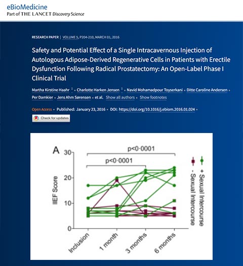 2016 年,一項發(fā)表在 eBioMedicine Part of THE LANCET Discovery Science 上的研究發(fā)現(xiàn),患有勃起功能障礙的患者在接受干細胞療法治療后,其勃起功能恢復(fù)。該項研究納入了 17 名因根治性前列腺切除術(shù)而導(dǎo)致勃起功能障礙的男性,所有受試者均在入組前 5-18 個月進行了根治性前列腺切除術(shù)。在該項研究中,這些受試者接受了單次海綿體注射自體脂肪源性再生細胞療法的治療,也即將其自身的自體脂肪干細胞移植到受試者的海綿體中。他們在接受治療后,并未出現(xiàn)嚴(yán)重不良事件。這 17 名受試者在接受干細胞移植之后的 1、3 和 6 個月均進行了 IIEF 評分,受試者中有 8 名男性恢復(fù)了勃起功能并能完成性交,恢復(fù)性交能力的受試者在 3 個月和 6 個月后 IIEF 評分顯著提升。