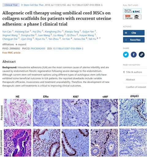 2018 年,26 例因復(fù)發(fā)性宮腔粘連(IUA)引起的不育癥患者參加了這項前瞻性,非對照,I 期臨床試驗,并進行了為期 30 個月的隨訪。在此過程中,按照粘連分離程序,將 1×10^7 臍帶來源的間充質(zhì)干細胞(UC-MSC)加載到膠原蛋白支架上,然后移植到子宮腔中。結(jié)果,未發(fā)現(xiàn)與治療有關(guān)的嚴(yán)重不良事件。術(shù)后三個月,患者平均最大子宮內(nèi)膜厚度增加,宮腔粘連評分較治療前降低。組織學(xué)研究顯示 ERα(雌激素受體α),波形蛋白,Ki67 和 vWF 表達水平上調(diào),而 ΔNP63 表達水平下調(diào),表明治療后子宮內(nèi)膜增生,分化和新血管形成得到改善。DNA 短串聯(lián)重復(fù)序列(STR)分析顯示,再生的子宮內(nèi)膜僅包含患者 DNA。截至 30 個月的隨訪期結(jié)束時,這 26 名患者中有 10 名已懷孕。